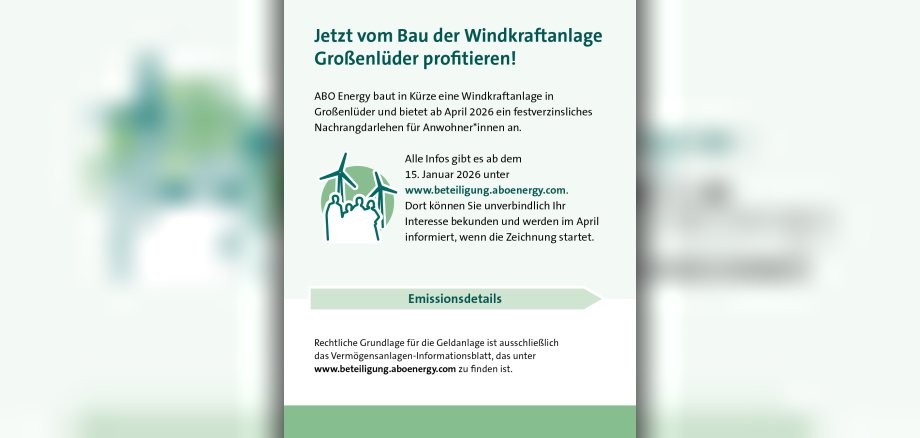 Bis zum 31. März 2026 können Anwohner*innen der genannten Gebiete sich auf www.beteiligung.aboenergy.com unverbindlich registrieren und Interesse bekunden, sich mit Beträgen zwischen 500 und 10.000 Euro zu beteiligen. Wer Interesse bekundet hat, kann später ein Nachrangdarlehen der ABO Energy Bürgerbeteiligung GmbH & Co. KG zeichnen. Rechtliche Grundlage für die Geldanlage ist ausschließlich das Vermögensanlagen-Informationsblatt, das unter www.beteiligung.aboenergy.com zu finden ist.