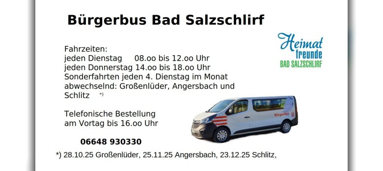 Über die Telefonnummer 06648/930330 können Sie am Vortag den Bus bis 16.00 Uhr bei unserem Disponenten anmelden. Wenn der Disponent nicht an das Telefon gehen kann, wird ein Anrufbeantworter Ihren Mitfahrwunsch entgegennehmen.